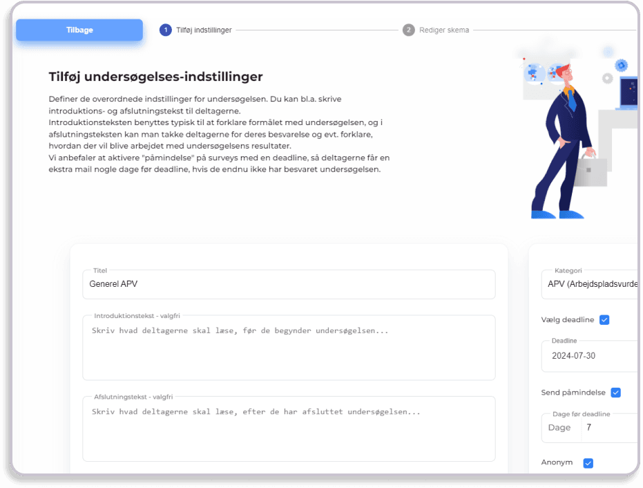 Uanset om du bruger vores skabeloner eller opretter din APV fra bunden, kan du altid tilpasse undersøgelsens emner og spørgsmål, anonymitetsindstillinger samt skrive intro- og afslutningstekst til deltagerne.