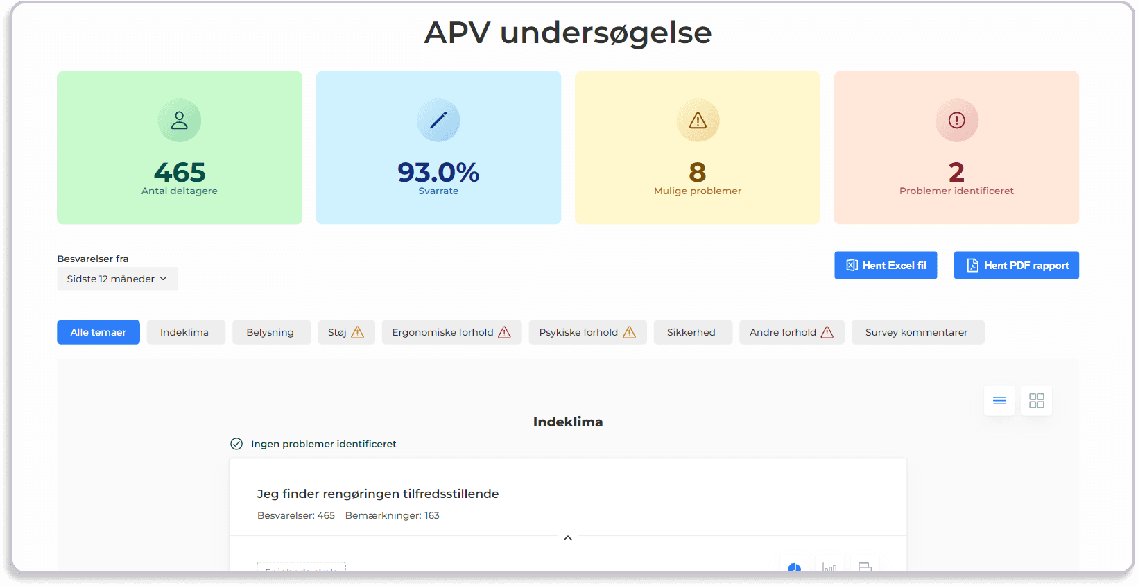 Værktøjet hjælper med at udpege mulige problemområder ved at markere temaer, hvor medarbejderne har svaret kritisk. Det gør det nemt for dig at identificere risici og forbedringsområder.