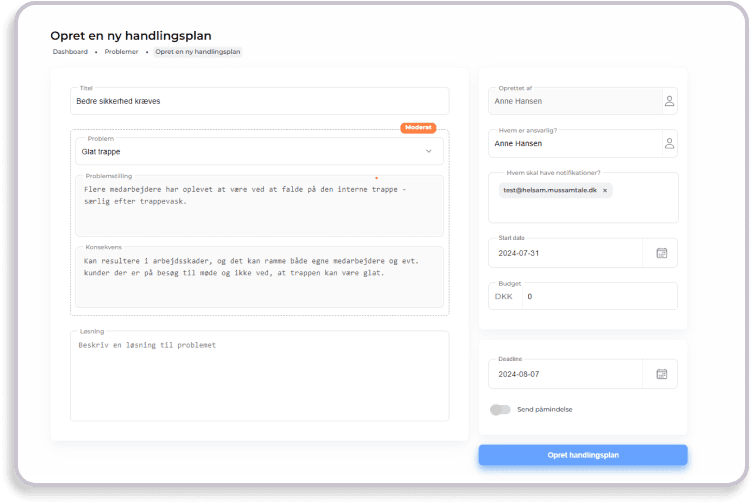 Når du har defineret nogle relevante problemstillinger baseret på APV-resultaterne kan du med få klik oprette handlingsplaner, tilføje ansvarlige personer, deadlines og budgetter.