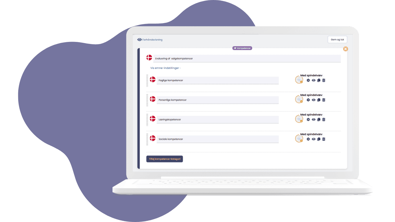 Vores værktøj gør det nemt at opsætte specifikke kompetencetemaer. Med få klik kan du tilpasse spørgerammen til at måle de kompetencer der er vigtige i din virksomhed. Du kan lave en spørgeramme til en specifik gruppe medarbejdere, og på den måde sikre, at alle medarbejdere vurderes konsistent og arbejder med de kompetencer, som er vigtige for deres funktioner.