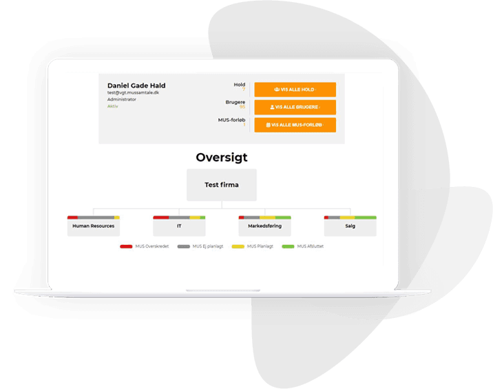 Som administrator (fx. HR eller systemansvarlig) har du overblik over hele organisationen. Får lederne planlagt deres MUS-samtaler til tiden? Bliver aftalerne overholdt? Du kan se alt, hvad du har brug for uden at gå på kompromis med fortrolighed og GDPR.