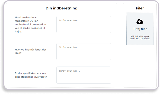 Whistleblower kan hurtigt og anonymt (valgfrit) indberette hændelser via en brugervenlig webformular, hvor der kan vedhæftes dokumentation.